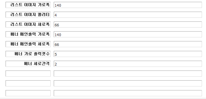게시판(banner_skin) - skin/board 에 업로드하신후 게시판생성(생성하실때는 헤더와풋파일겨로를 넣지않고 공란으로 두세요) -> 게시판설정하단의 여분필드를 그림과같이 설정해주세요