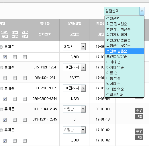 접속일순, 회원가입순, 회원권한순, 이름순, 닉네임순 은 물론