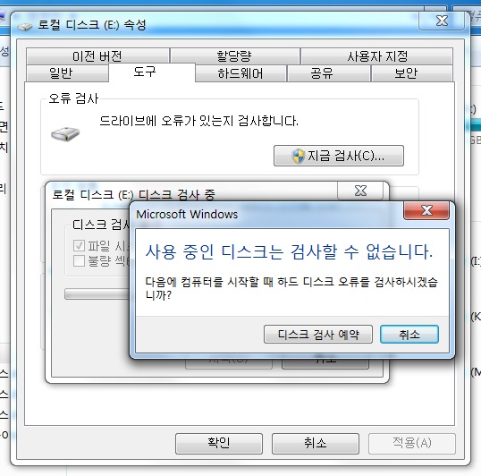 윈도우 7 이하는 부팅된 하드를 자체검사할수 없습니다