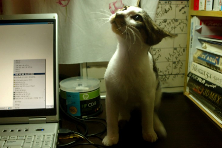 이녀석은 유독 귀여운 짓을 하네요. 전에 기르던 고양이는 늘 제 발 밑에 거주 했었는데....녀석은 지금 장롱보다 높은 곳에 살고 있습니다.
