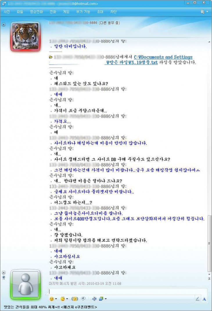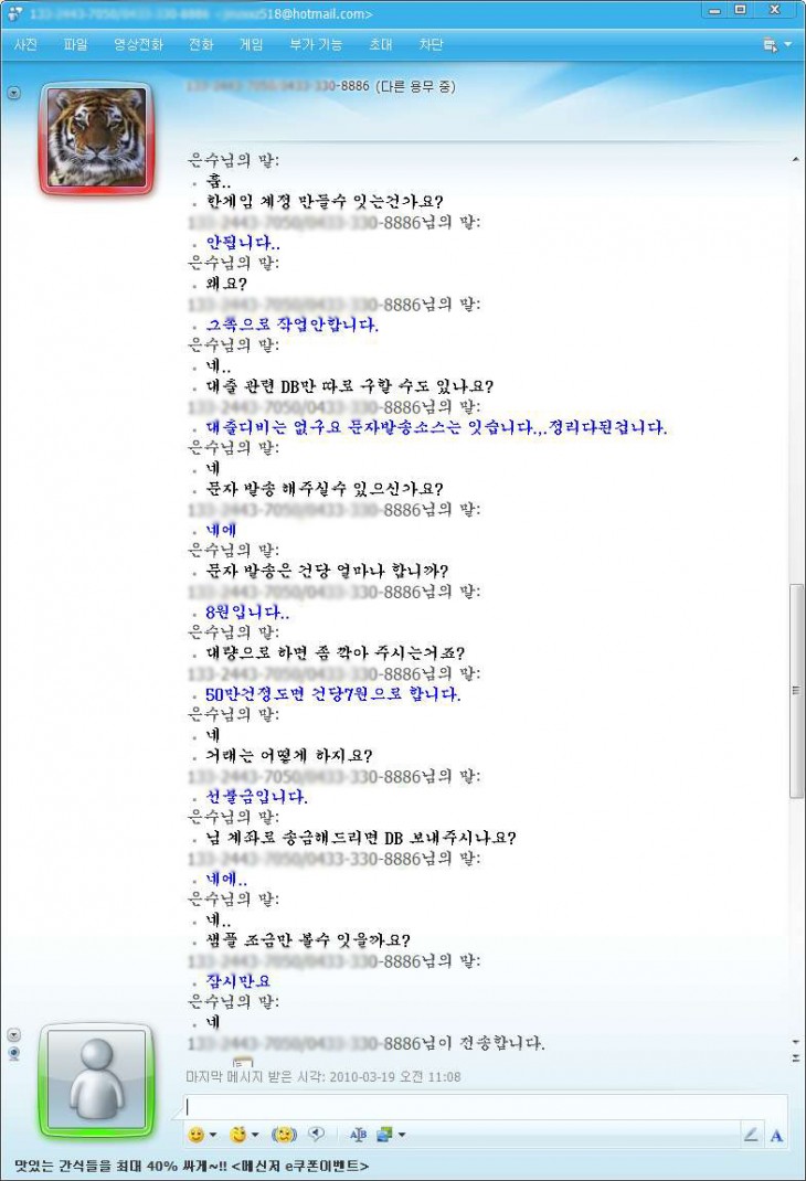 개인정보 9원 / 문자발송 7원 / 해킹 400 이랍니다..
