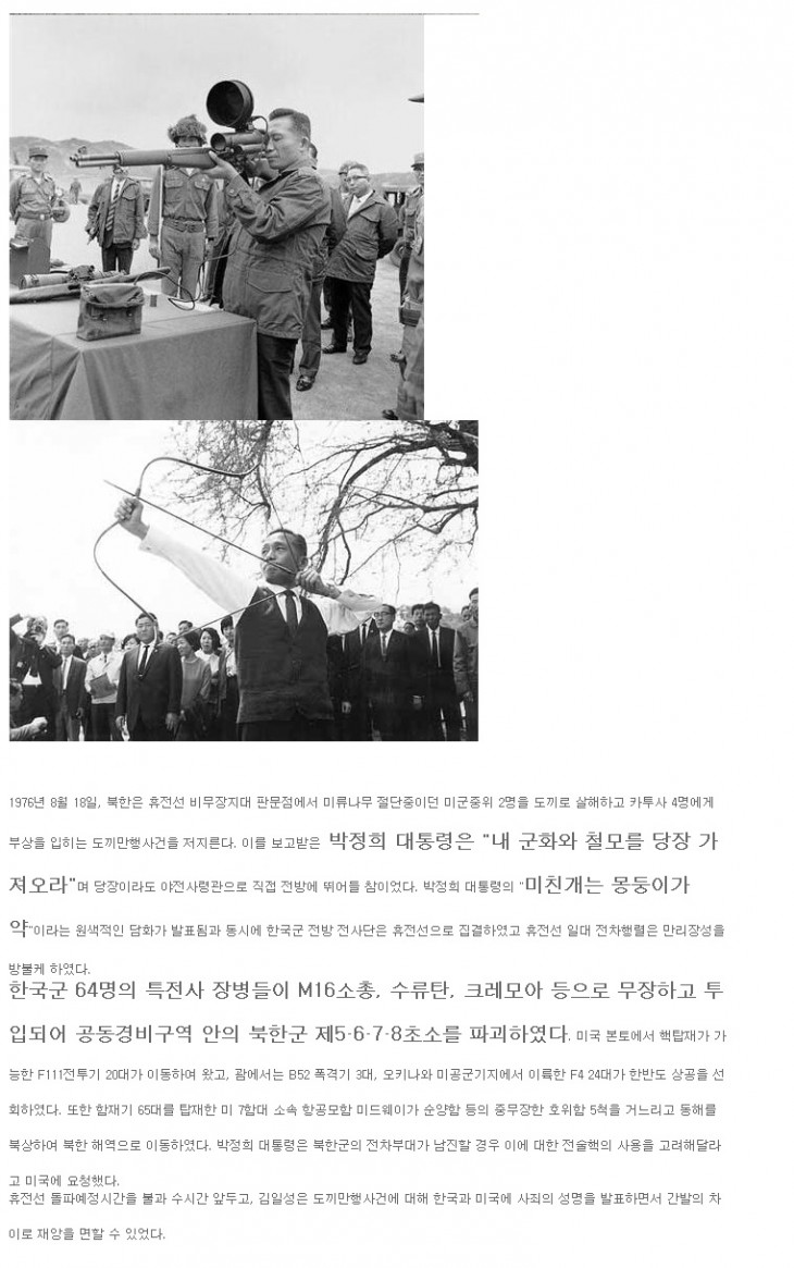 여기저기 사이트에서 이글이 눈에 많이 띄어서 관련 정보를 한번 검색해봤는데 미군장교 사망 사건이라 미국쪽에서 강경 대응한걸로 나오는데 저글은 박정희가 다 한것처럼 묘사가 됬네요..