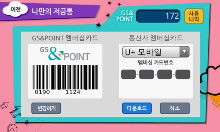 어플을 열면 GS포인트카드 와 KT 멤버쉽 카드가 나오고....적립된 GS포인트도 알수 있습니다...