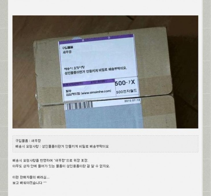 이왕 배려하실꺼면... 배송문구도 지우셨다면.. ㅋㅋ