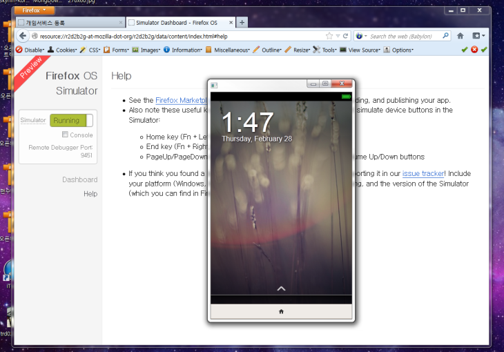 파이어폭스 버전을 업데이트 하시면 애드온(addon)으로 Firefox OS 를 시뮬레이터 해보실 수 있습니다.