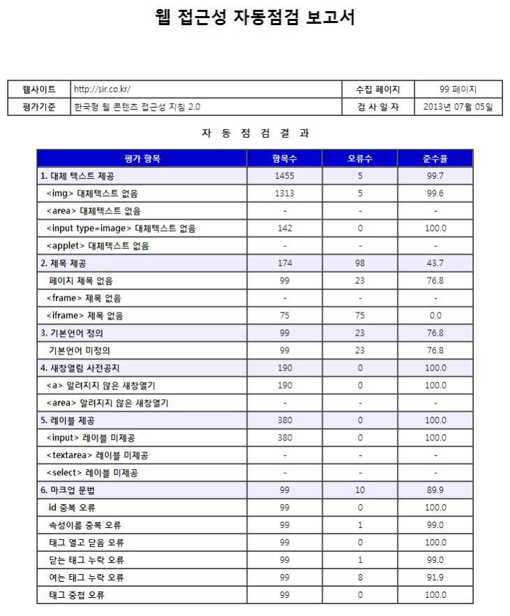 SIR(한국형 웹 콘텐츠 접근성 지침 2.0 - K-WAH4 검사결과 (수집 : 99페이지) ) - 웹 접근성 자동점검 보고서 정보