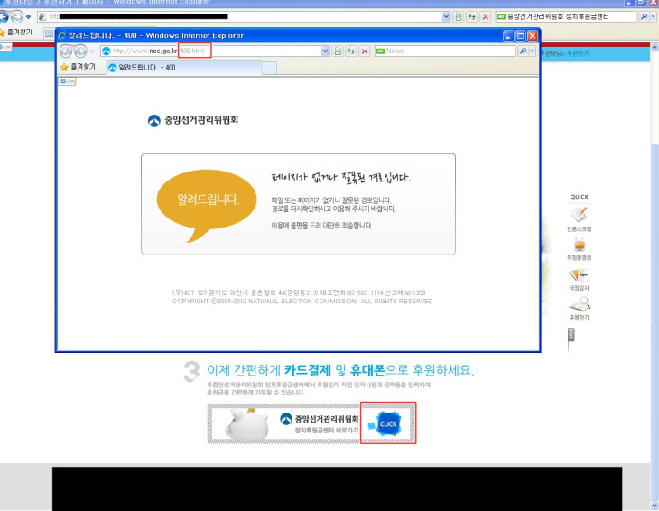 밑에 빨간 네모를 클릭하면 중앙선관위 정치후원금 홈페이지(http://www.give.go.kr/)에 들어가야 되는데 저렇게 뜨네요