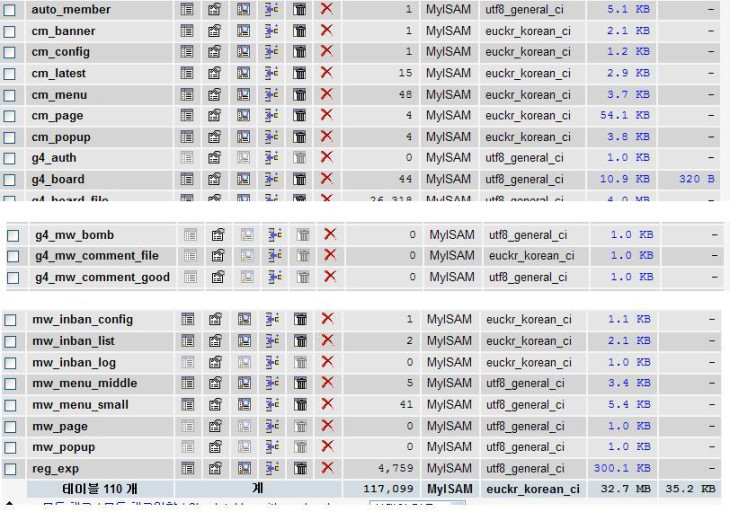 맨밑 사진에 보시면 utf8_general_ci 로 되어있으니 euckr_ 이걸 저걸로 모두 변경해보세요