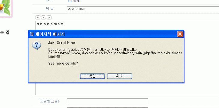 그누보드 게시판 사용하는데 글쓰기에서 내용을 다 적고 쓰기 버튼을 누르면 오류메세지가 뜨는데 확인하고 누르면 별 이상없이 작동은 해요.근데 위에 보이는 문구가 왜 자꾸 뜨는지 모르겠는데 아시는 분 가르쳐주세요~~