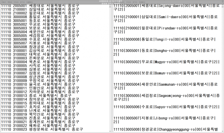 오른쪽이 도로명 주소 안내시스탬.go.kr 에서 배포하는 원본 DB파일입니다;;