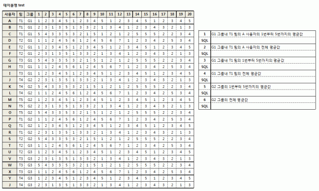 1. G1 그룹내 T1 팀의 A 사용자의 1번부터 5번까지의 평균값