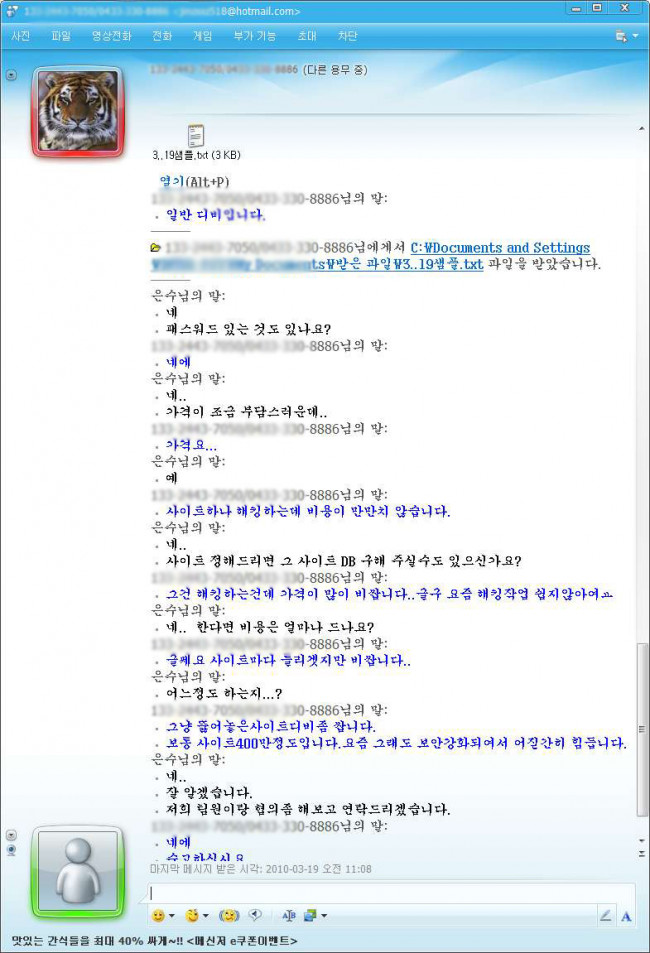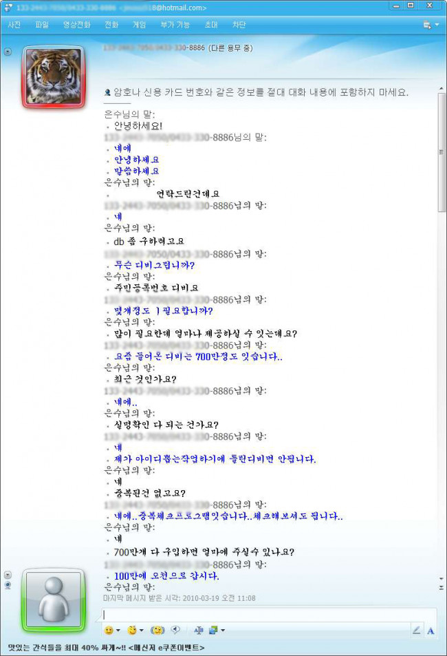 개인정보 9원 / 문자발송 7원 / 해킹 400 이랍니다..