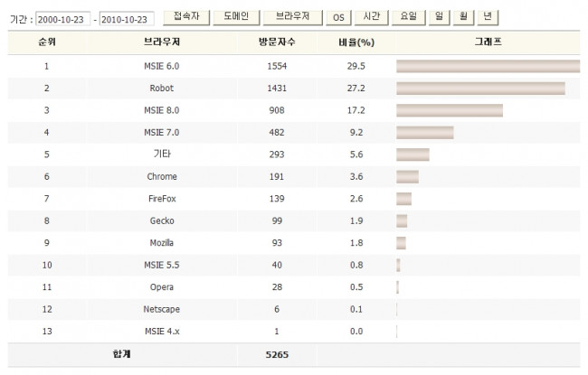 브라우저별 접속자현황.. IE6까지는 뭐 그렇다쳐도.. 다음이;;ㅜㅜ 정보 브라우저별 접속자현황.. IE6까지는 뭐 그렇다쳐도.. 다음이;;ㅜㅜ 바이탈 홈페이지 자기소개 아이디로 검색 회원게시물 홈페이지 자기소개 아이디로 검색 회원게시물 2010.10.23 22:19:34 조회 1,291 댓글 0 이전 게시글 다음 게시글 목록 본문 2000 ~ 2010 년 현재까지..IE6이 1등이지만 2등이.. 로봇이군요 슬퍼요!! 로봇들이나마 더 오게하는법 없을까요?ㅜ 댓글 전체 이전 게시글 다음 게시글 목록