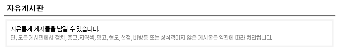 <div style="padding:5px; border:3px solid #ddd;">기본 개념이 없는 게시물 때문에 회원만 게시물을 남길 수 있습니다.<br />단, 모든 게시판에서 정치, 종교, 지역색, 광고, 혐오, 선정, 비방 등 상식에 벗어 난 게시물은 약관에 따라 처리합니다.</div>