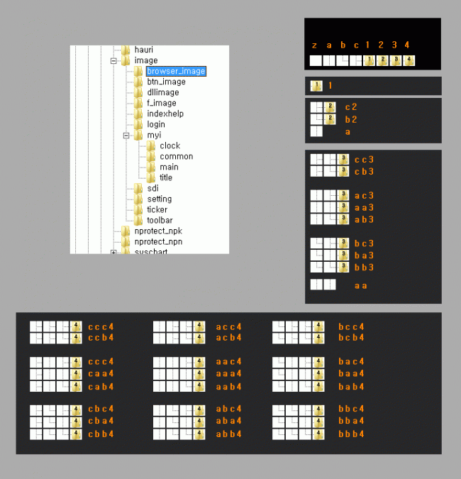 웹에서 구현하시는거라면 자바스크립트로 만들어진 모듈을 어디서 본거 같습니다...jquery같은게 아니고 그냥 짜여져 있었는데 복잡해지신 이유가 한 라인을 모두 합쳐서 보려고 하셔서 그런거 같네요...단순히 줄의 칸 하나하나를 이미지로 보면 4개정도 이미지밖에 나오지 않는거 같은데요(폴더이미지 부분은 별도로 봐야되구요)