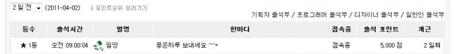 4월 2일에 프로그래머 출석 게시판에서 1등 먹었어요.
