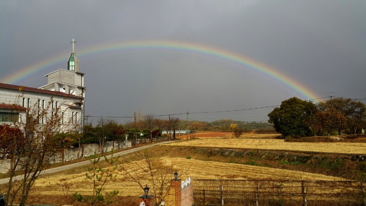 오전부터 비가와서 우울했는데.. 오후에 해가 뜨길레 현관문을 열어보니.. 무지개가 떠 있네요..