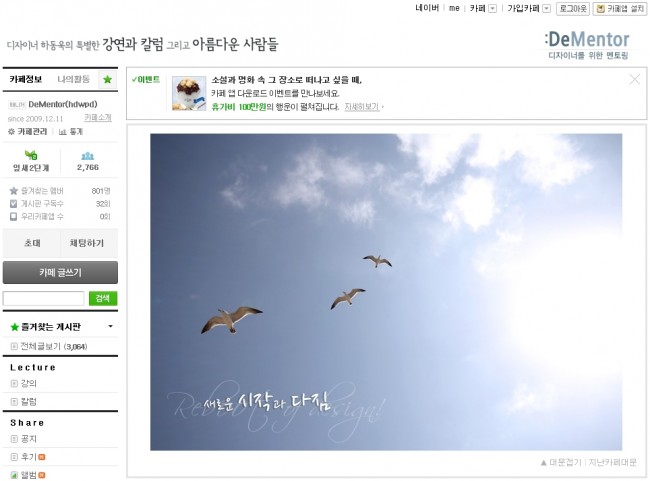 디자이너를 위한 멘토링, 디멘토에 초대합니다! 정보 디자이너를 위한 멘토링, 디멘토에 초대합니다! hapd 자기소개 아이디로 검색 회원게시물 자기소개 아이디로 검색 회원게시물 2013.06.12 21:00:57 조회 4,032 댓글 0 관련링크 http://cafe.naver.com/hdwpd 260회 연결 이전 게시글 다음 게시글 목록 본문 http://cafe.naver.com/hdwpd 디자이너를 위한 칼럼, 강의, 친목모임, 정보와 노하우가 있는 커뮤니티! 디멘토에 초대합니다! 추천 0 댓글 전체 이전 게시글 다음 게시글 목록
