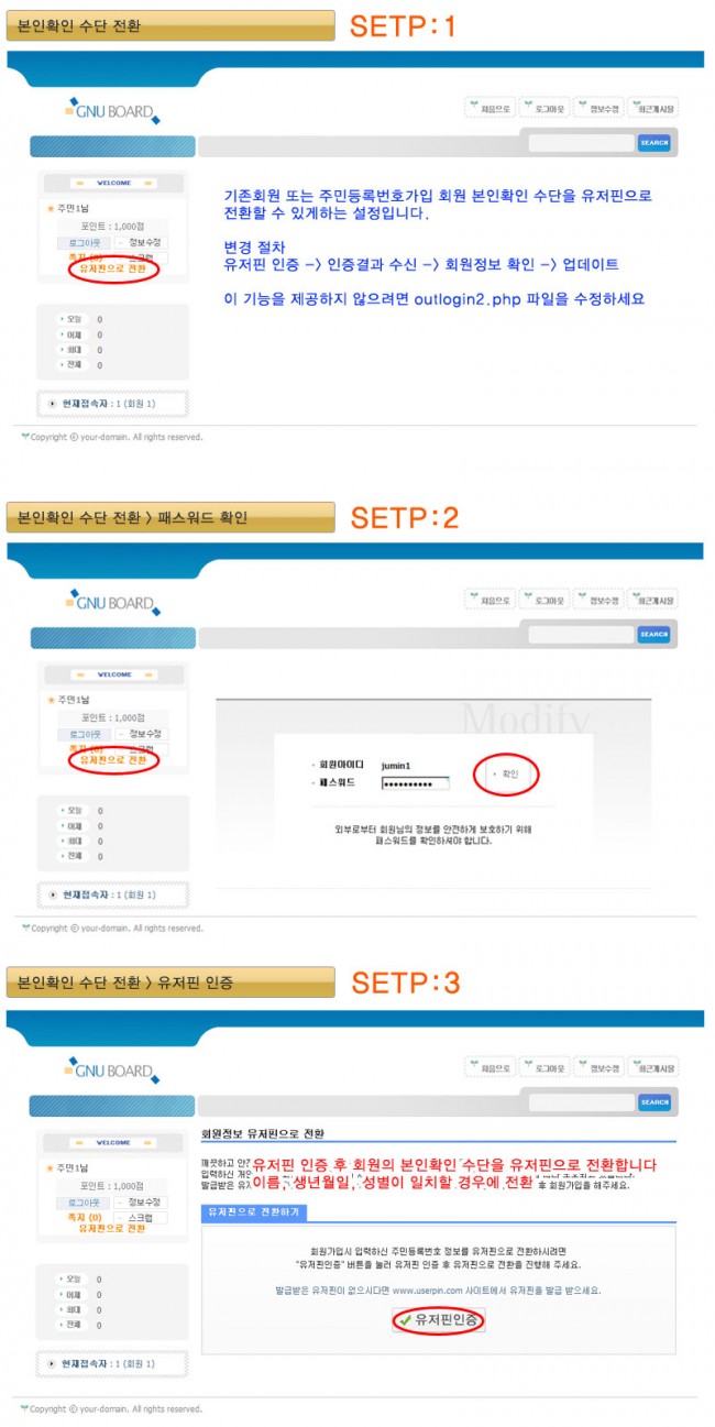 그누보드 기본 버전에 유저핀 서비스 중 USERPIN-CERT 서비스만 연동된 버전입니다.