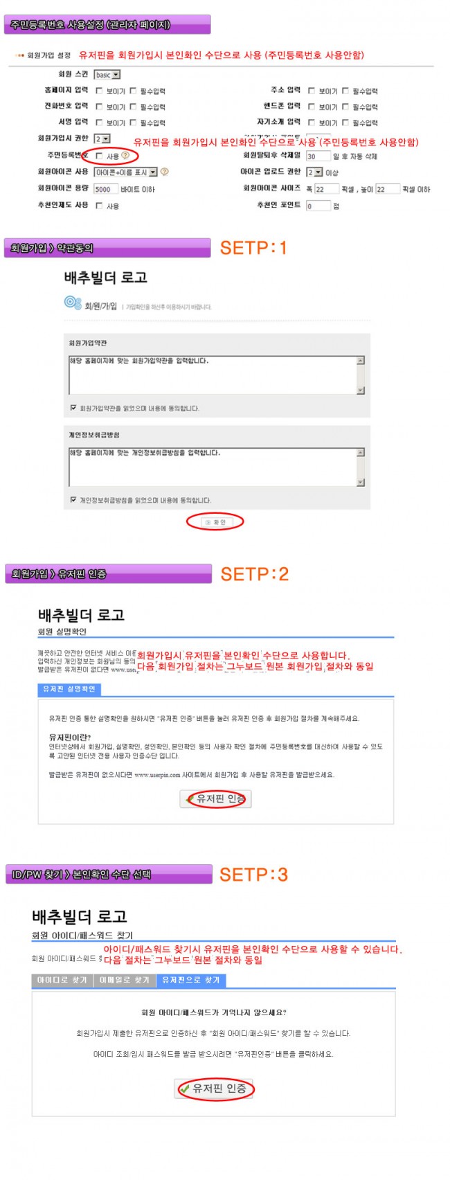 주민등록번호, 유저핀 사용 설정은 관리자 페이지 -> 기본 환경설정 매뉴에서 변경할 수 있습니다.