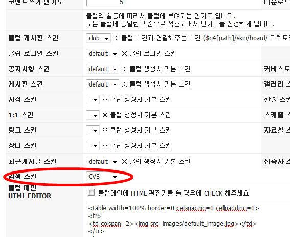 사진1: 검색 스킨(클럽 메인의 스킨도 동일) 지정에서 default 로 지정하면 엉뚱한 것이 선택됩니다.