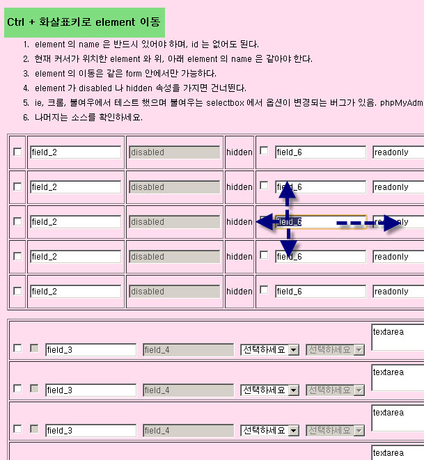 phpMyAdmin 은 element 의 id 값을 이용하여 x, y 값을 변경하는 것에 비해 이 플러그인은 id 값 설정없이 같은 form 안에 있는 element 간 이동을 합니다.