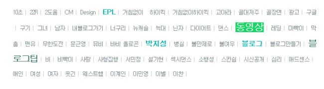 다음과 같이 인클루드 해서 사용하세요. <? include_once("파일경로/파일명"); ?> 207, 214라인의 이미지를 설정하세요. (본 파일에는 이미지가 포함되지 않았습니다.) 39라인의 기간을 설정하세요. (기본 30일로 되어있으며, 30일간 인기 태그를 뽑습니다.) 47~58라인 숫자 변경하세요. (기본 10, 5, 3 으로 되어있으며 숫자에 따라서 글씨가 바뀝니다.) 43라인의 60이란 숫자는 60개의 태그를 뽑는 것 입니다. 설명 끝. 이하 index.php 파일의 부분적인 부분도 위 내용과 동일함. |
