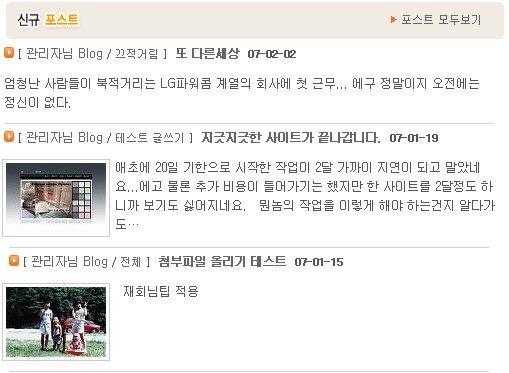 어느님의 사이트에 가면 위와 같이 블로그메인에 신규포스트에 첨부화일 이미지 까지 텀보이미지로 나타나는 방법을 좀 알려 주세요....