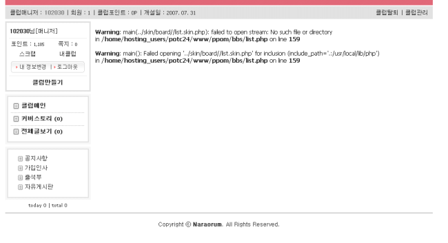 클럽 설치하고 클럽 생성했는데 게시판이 다 애러나 나나요. 정보