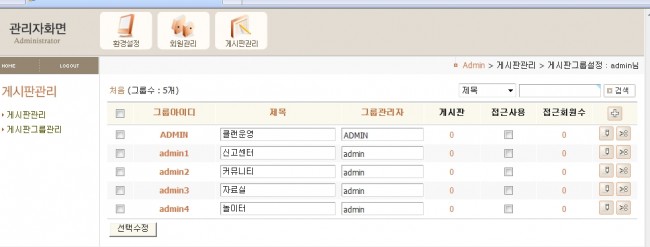 공지사항 게시판은 존재하지만 관리자페이지에서는 보이지 않네요