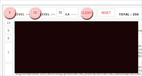 원하는 등급에서 등급까지 숫자를 입력하고 클릭하면 오른쪽에 30개씩 메일목록이 정리되면서 출력됩니다. 컴마도 찍혀 있으니 그대로 카피해서 가져가면 되겠죠.