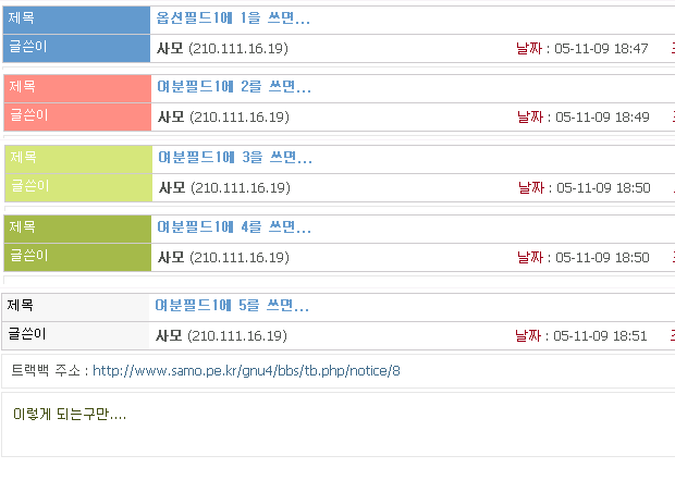 여분필드 1에 1~5까지 숫자 넣으면 색깔만 바뀝니다. ㅡㅡ;;;