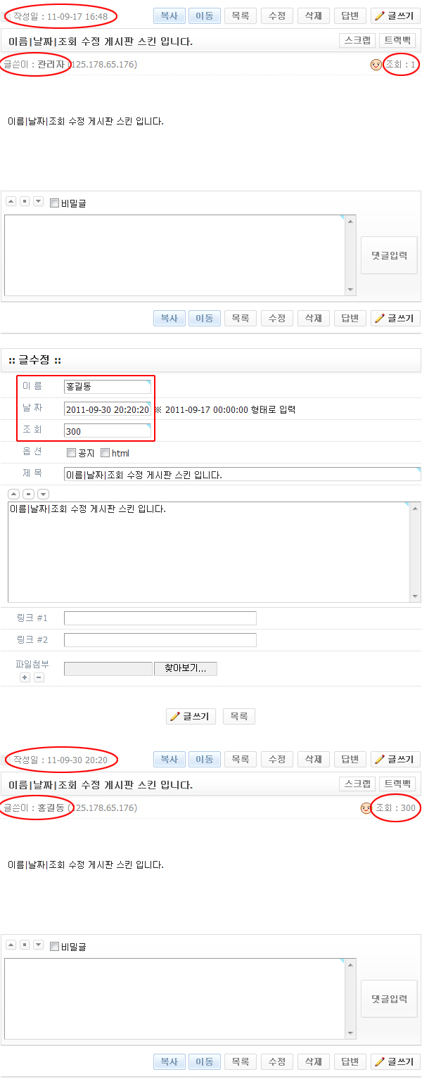 참 필요하고 훌륭한 스킨입니다. 한가지 궁금한점은.. 비회원이 자신이 쓴 게시글을 수정하면 조회수와 날짜가 모두 0으로 표시 되네요.