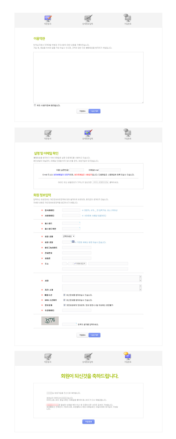 (이용약관/정보수정/가입완료 3가지)