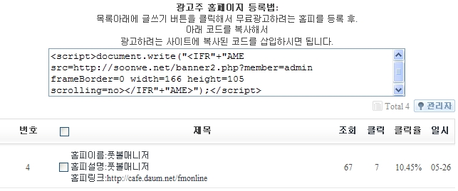 그리고 지금 설치되신 코드가 http://450won.giyo.me/banner2.php?member=회원가입한아이디 회원가입한 아이디로 되어있는데요 이걸 원본대로 php 코드를 써서 홍보작성자 아이디로 되어야 합니다.