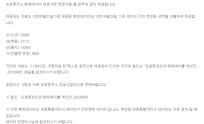 도로명주소 - 6월 대표지번 매칭 데이터 자료 입니다. ( 전체 DB ) 정보