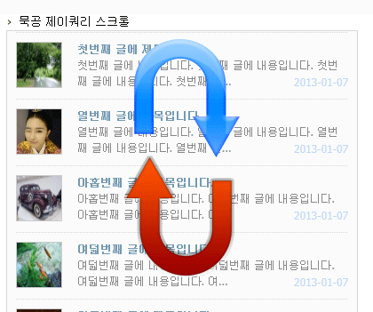 <? echo latest("mk_weiboscroll", 게시판 테이블이름, 10, 0); //묵공 제이쿼리 스크롤 최신글 ?>
