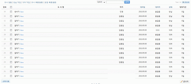 대여작업의 경우 계속 대여 작업 창이 뜹니다. 그 이유는 도서를 한권만 빌리는 것이 아니고 또 여러 명이 계속 빌리므로 대여 작업 시는 대여 작업 창만 뜨니 등록이 안되었다 생각하지 마시고 계속 작업하면 됩니다.