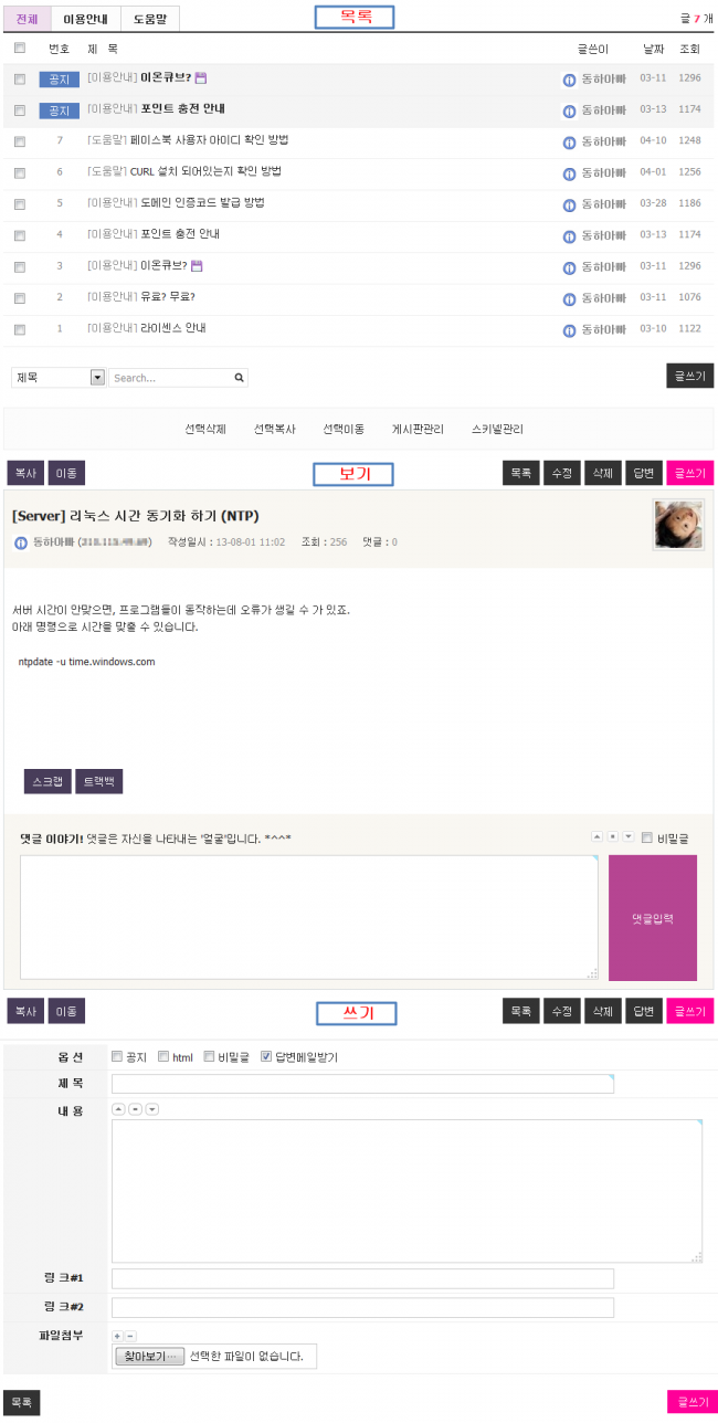 스킨을 목록,웹진,겔러리,방명록 형태로 설정해서 사용할 수 있습니다.