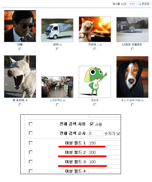 이미지를 업로드하면 관리자의 여분 필드에 입력한 이미지 사이즈에 맞게 썸네일 이미지를 생성합니다.