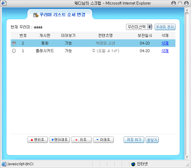 이 게시판 리스트에서 자신이 만든 꾸러미에 담았다가 담겨져 있는 플래시 컨텐츠를 이어보기 할수 있도록 만들었습니다.