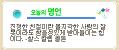 "진정한 친절이란 몰지각한 사람의 잘못을 참을성있게 받아들이는 힘이다." 이말의 참뜻은 그렇게 받아들이란 말이 아니라 그런 정도의 인내력을 발휘하란 말인듯....??  참을성의 한계는 어디까지 인가....좋은 스킨과 한순간의 명상을 제공하신 시그너스님께 심심한 감사를 드립니다. 비와 음악이 절묘하게 어우러지네요^^