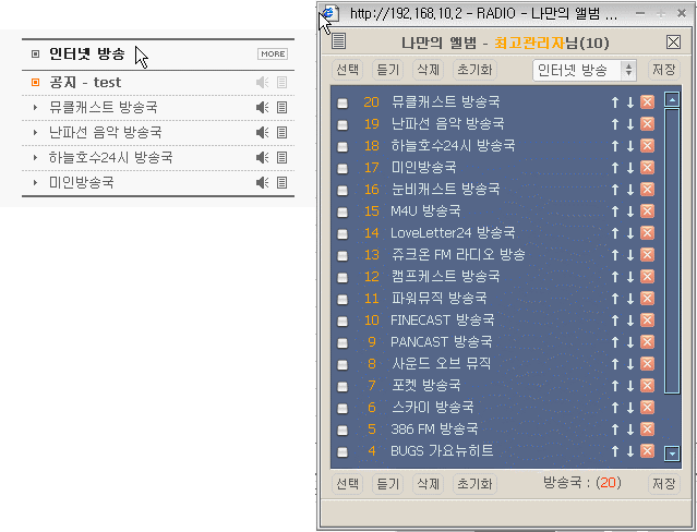 4. 음악(찬양)게시판 실행하여 보면 실행된 게시판 오른쪽 아래 쪽에 보시면 설정, 관리자 메뉴가 있습니다.