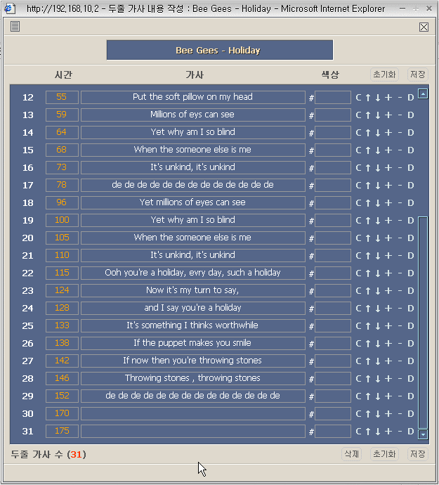 알송으로 가사추출하여 그파일을 서버에 올리는것으로 가사입력하는건 해결하여 잘쓰고있습니다