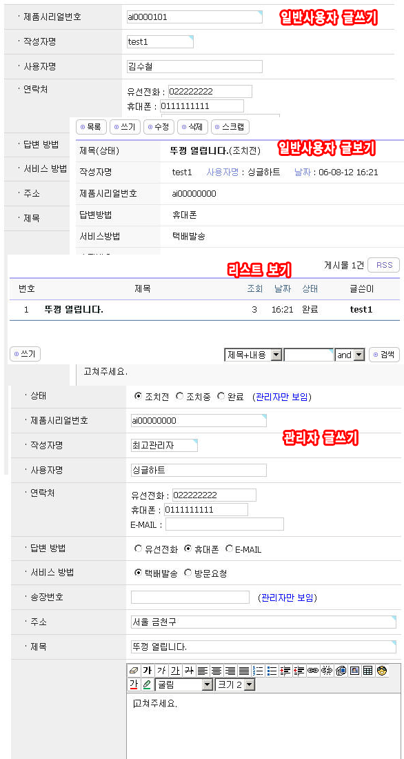 이것 저것 짜집기를 했는데 아마 제안게시판하고 질문답변 게시판 조합입니다.