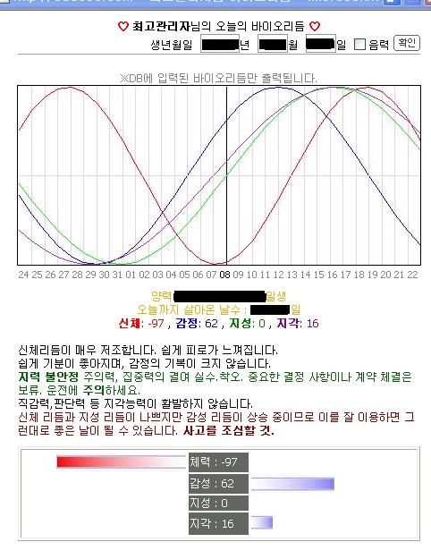 참고로 여기에 올린 바이오리듬에 보편적인 3개의 바이오리듬(체력,감성,지성) 이외에 지각리듬이 추가된 것입니다.