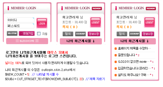 로그인후 나의최근게시물이 보이는스킨입니다.