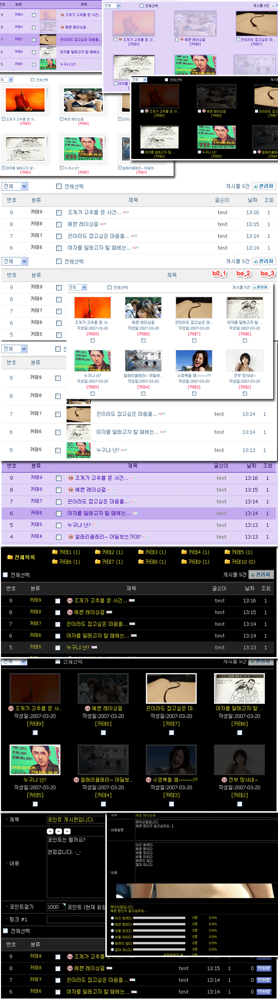 스킨 하나로 베이직, 리스트형 갤러리, 갤러리, 추천/배너 스킨, 설문조사, 포인트 게시판 등 여러가지 기능을 넣었습니다.
