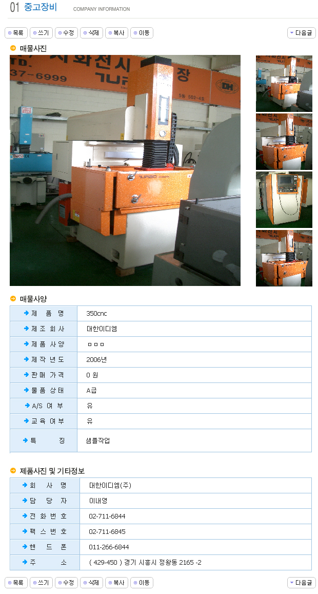 - 제품(매물)사진 및 기타정보 : 회사명, 담당자, 전화번호, 팩스번호, 핸드폰, 주소 등