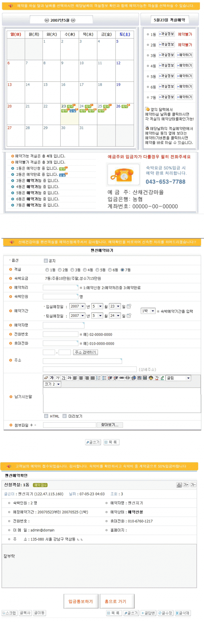 일전에 했던 산채건강마을이라는 홈페이지를 리뉴얼해주면서 펜션예약하기게시판부분을 다시 만들었습니다.